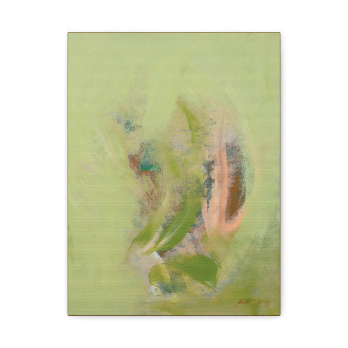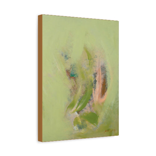 Bring a calm, natural presence into any room with this matte stretched canvas in a soft green abstract. The gentle brush-like shapes and layered tones evoke early morning light filtering through leaves. Hung above a bedside table or leaned against a mantel, the piece creates a quiet, restorative pause in a busy day. The subtle texture of the cotton-poly canvas and the muted matte finish keep the focus on the soothing composition, while the lightweight pine frame and included hanging hardware make it easy to place where it will be seen and felt.