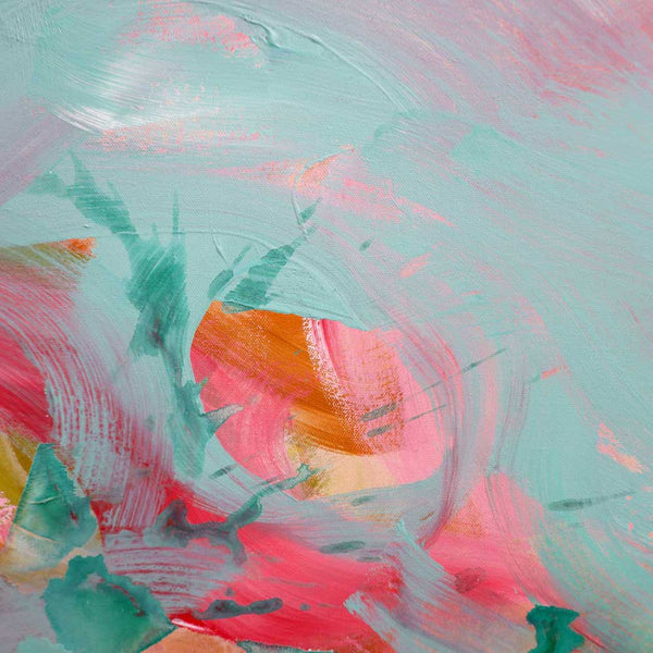 "Where Color Dreams" drifts between serenity and quiet rebellion. Soft turquoise strokes move like a gentle mist, revealing flashes of vivid pinks, corals, and greens underneath—an inner world stirring to life. The painting invites the viewer to pause, look closer, and discover the hidden warmth rising through the calm surface.
